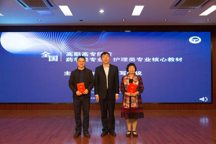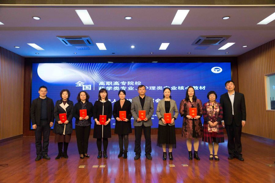 ▲四位专家作经验交流和心得分享 会上还举行了核心教材主任委员及主编聘书颁发环节,标志着新一轮药学类专业、护理类专业教材编写正式启动。