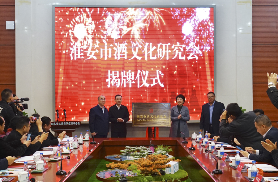 ▲袁孟贤宣读成立批文 王红红、赵志鹏、陶书中、羊栋共同为淮安市酒文化研究会揭牌。