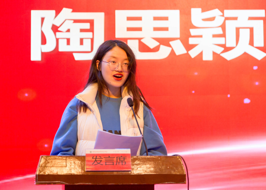 来自食科191班的陶思颖同学作为学生代表做交流发言,她首先感谢学校领导和老师们对学生学业的支持与教导,接着从升学和就业等方面分析了英语学习的重要性,并分享了自己的英语学习经验,建议同学们要保持每天背新单词的好习惯,利用好碎片时间,以赛助学,以赛助考,设立合理目标并持之以恒。