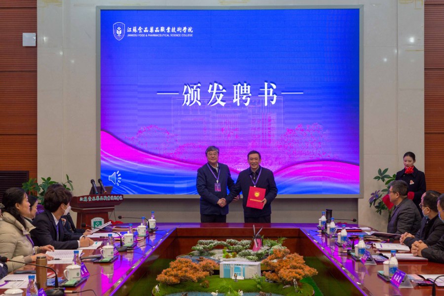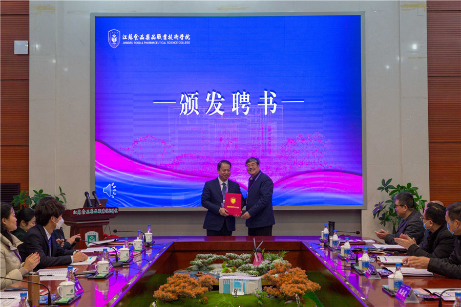 ▲党委书记陶书中致欢迎辞 会议审议并通过了江苏食品药品职业技术学院合作办学理事会增补理事成员名单,理事长胡晓抒为增补理事颁发了聘书。