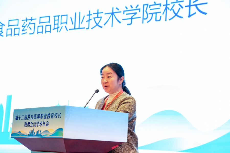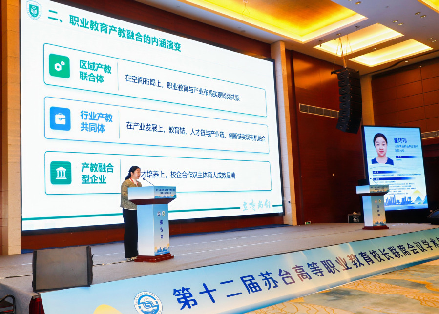 淮安市人民政府副市长王向红讲话 会上,我校校长翟玮玮作题为“以产教融合推动职业教育高质量发展的思考与实践”的主旨报告。她围绕“五业”联动,提出“四位一体,三层联动、三聚三化”的“433”产教融合工作模式,分享了我校在推动产教融合实体化、数智化、国际化方面的实践探索。通过聚力区域主导产业转型升级、聚焦科技创新发展前沿趋势、聚合政行企校多方优势资源,我校实现了教产深度融合,以教促产、以产助教,共同推动职业教育迈向新高度。