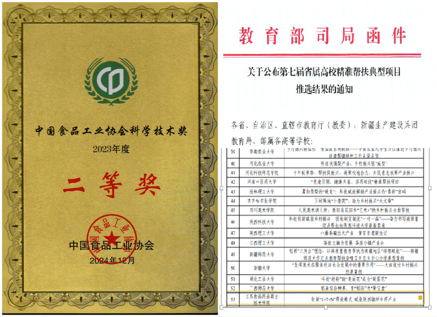 八、全省职业院校唯一获评教育部精准帮扶典型项目,科技服务迸发新动能 荣获中国食品工业协会科学技术奖二等奖,学校实现历史突破。获评教育部省属高校精准帮扶典型项目1项,为全省唯一获此殊荣高职院校。获批国家自然科学基金1项,省级以上自然科学基金、教育科学规划课题7项。立项省发改委“工程研究中心”1个,江苏省大型科研仪器开放共享绩效评价良好,全省高职院校第1,科研与社会服务竞争力位列全国高职第44名。