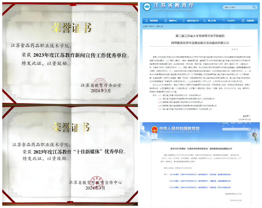 二、教育部“思政精品”项目推荐数量全省第一,铸魂育人突显新质效 学校4项“思政精品”项目推荐至教育部参加评选,推荐数量全省高职院校第一。入选教育部“礼敬中华优秀传统文化”宣传教育活动、省级思政精品、省“一节一推选”、省“技能成才、强国有我”优秀成果展示等省级以上奖项12个。学校获评江苏省新闻宣传工作优秀单位和“十佳新媒体”优秀单位,学校发展成果全年在人民日报等国家级媒体刊发17篇、省级媒体刊发112篇。
