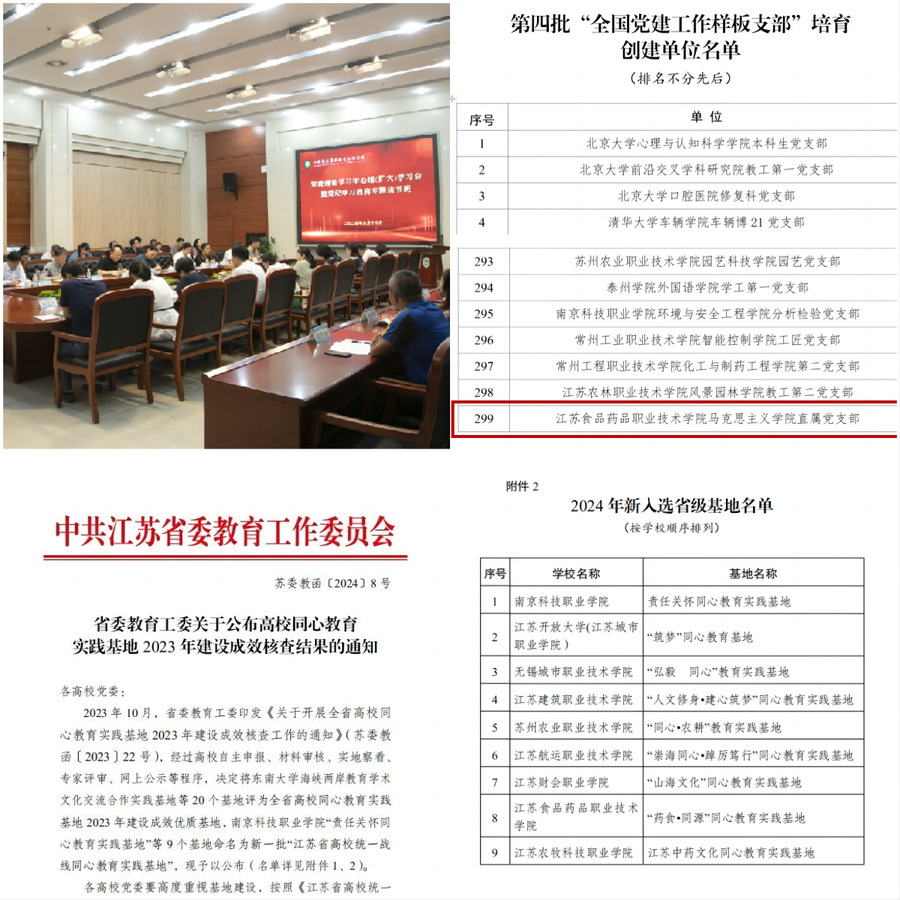 2024年,学校以习近平新时代中国特色社会主义思想为指导,深入学习贯彻党的二十届三中全会精神和全国教育大会精神,扎实开展党纪学习教育,全年共获得省级及以上成果与荣誉115项,42项位列全省“国家双高院校”前6,46项为学校历史新高或历史首次突破,学校以“优秀”等级通过国家“双高计划”终期验收,学校取得近年来高质量发展新的突破。 一、再次获批“全国党建样板支部”,党建工作实现新突破 学校全年共获得党建思政类荣誉24项。获批全国“党建工作样板支部”培育创建单位1个,验收通过1个。获全省高校统一战线同心教育实践基地1个,省“党建工作标杆院系”培育建设单位1个、“党建工作样板支部”培育建设单位2个、最佳党日活动1个。全省高校“双带头人”教师党支部书记“强国行”专项行动团队1个。