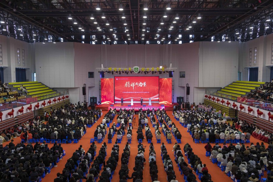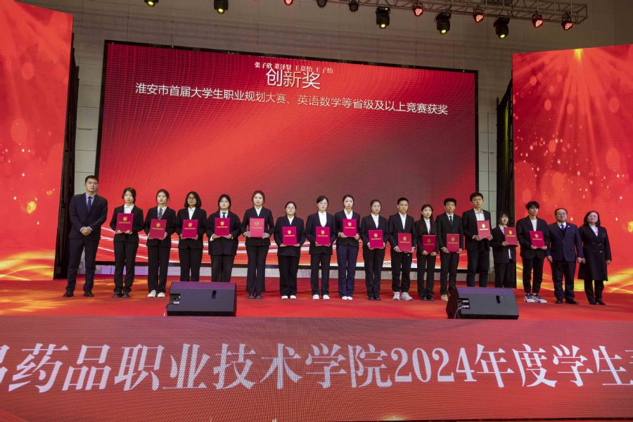 校长翟玮玮致辞 本次大会表彰了世界职业院校技能大赛、大学生创新大赛国赛、第十四届“挑战杯”中国大学生创业计划竞赛国赛、江苏省职业院校技能大赛、大学生创新大赛、“挑战杯”中国大学生创业计划竞赛中获奖学生代表48人。会上还表彰了省级非技能类竞赛、省级及以上体育竞技类竞赛、省级及以上英语数学等竞赛、淮安市首届大学生职业规划大赛获奖学生代表33人;2023-2024学年各级各类先进集体和优秀个人代表,包括国家奖学金30人、省级先进班集体5个、省级三好学生5人、国家励志奖学金9人、校级奖学金27人以及校级先进志愿者及社团先锋代表10人。