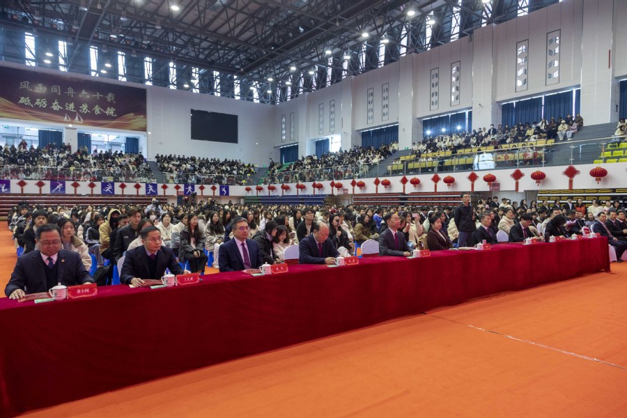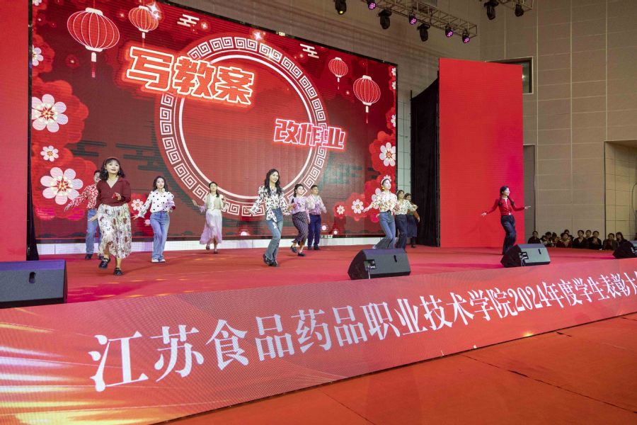 党委书记薛宇讲话 校艺术团、校合唱团、武术社团、大学生广播站等分别带来的《向星而舞》《我爱你中国+小美好》《武道群雄》《起舞盛世》《盛世中国》等精彩节目,展现了学校五育并举的丰硕成果和苏食院学子深厚的爱国情怀。辅导员老师们带来活力四射的舞蹈《教师阵线联盟》,传递出师生携手共进、朝气蓬勃的校园氛围。节目《寻梦 逐梦 圆梦 启梦》特别邀请淮安市第二人民医院护士长徐莉、健康医学院辅导员何婕与学生们一同生动演绎,通过情景再现、对话交流等形式,生动呈现了同学们初入大学探寻梦想、学业实践中坚定逐梦以及矢志终圆梦的感人瞬间,令台下观众沉浸于这场砥砺奋进的青春追梦之旅,激励同学们勇敢追梦、启航未来。