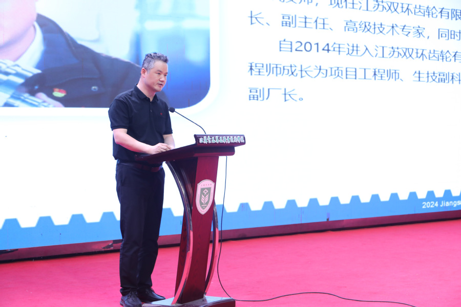 陈天驰老师演讲 在“岗位暖心”环节,市人社局职业能力建设处处长蒋礼涛作题为“培训赋能就业,技能照亮前程”的报告,分析就业形势,强调一技傍身的重要性。中天钢铁、旺旺集团、昊昊王子、世昌农牧集团、天鹅湾公司等介绍招聘岗位和薪资优势,向毕业生们发出橄榄枝。最后,学校优秀毕业生韩鹏从“以热血,致山河”“因热爱,精专业”“为梦想,勇创业”“致青春,唯奋斗”四个层面,分享自己学习和创业的故事,并勉励学弟学妹起点或许平凡,但跬步能积千里,微光终成星河。