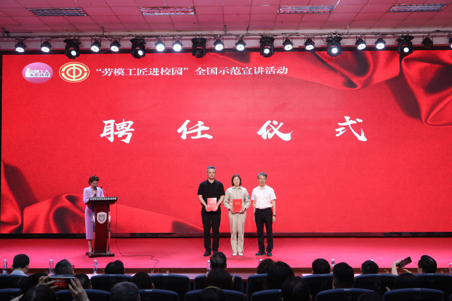 党委书记薛宇致辞 在“榜样立心”环节,全国劳动模范朱玉庭分享“从‘落榜生’到大国工匠”的感人故事,剖析自身从农民工到大国工匠的蜕变,靠的是心怀感恩、矢志不渝的奋斗,同时对毕业生们提出勤学不辍方能筑梦远航的殷切期望。全国劳动模范吉兰芳讲述“从中专生到创新能手”的追光之路。吉兰芳将自身成长经历凝练成“向下扎根,方能向上生长”“眼里有光,心里有爱,脚下有路”“独行快,众行远,美好生活需共同努力”三条人生感悟与同学们共勉。同学们怀着崇拜与热爱之情,向两位全国劳模现场提问,两位劳模均结合自身实践进行答疑解惑。最后,我校副校长贾韶千颁发聘书,特聘两位劳模为我校“劳模工匠兼职辅导员”。