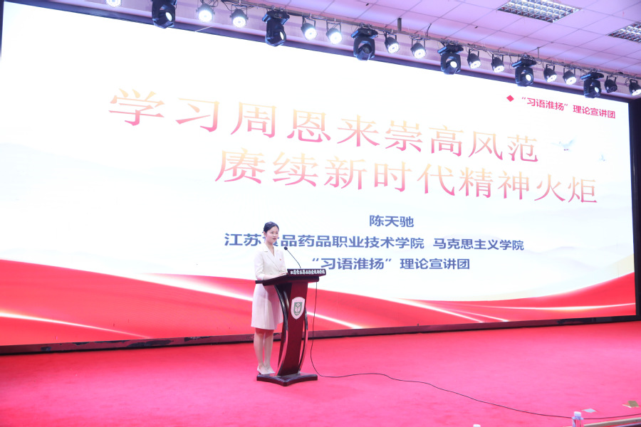 副校长贾韶千颁发聘书 在“理论润心”环节,我校教师陈天驰作题为“学习周恩来崇高风范 赓续新时代精神火炬”的报告。陈老师从周恩来总理“不忘初心 坚守信仰”讲起,回顾周总理信念坚定、为民服务的一生,并勉励同学们学习周恩来崇高风范,以初心如磐锚定人生航向,将“小我”融入“大我”,以信仰如炬点燃奋斗激情,以专业技能为楫,以报国志向为帆,在新时代的激流中奋力划桨。