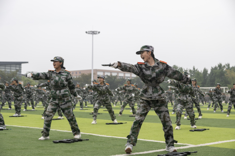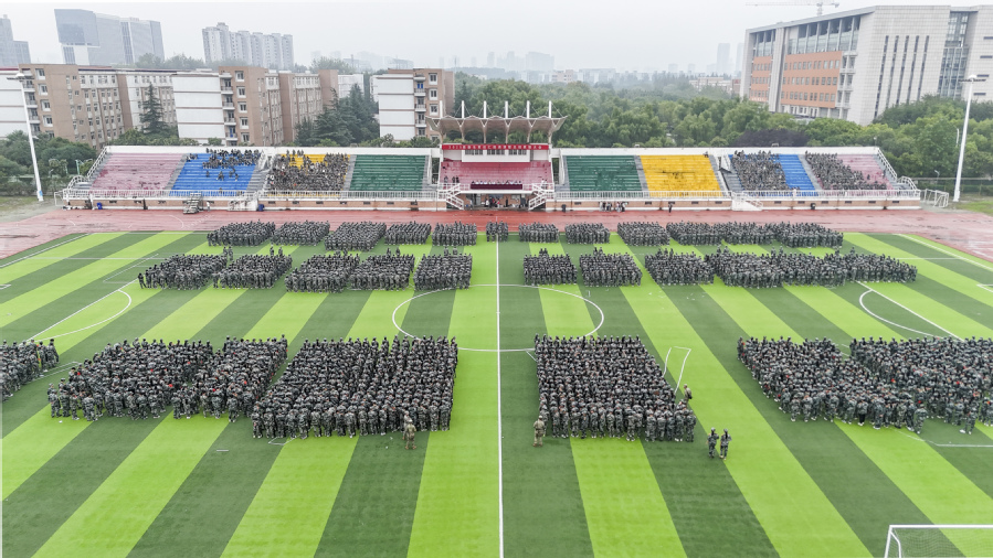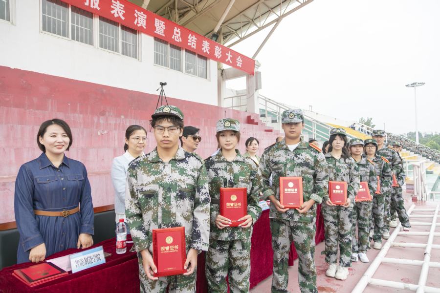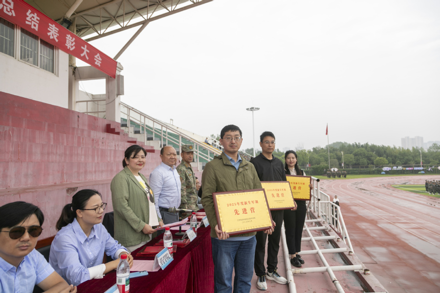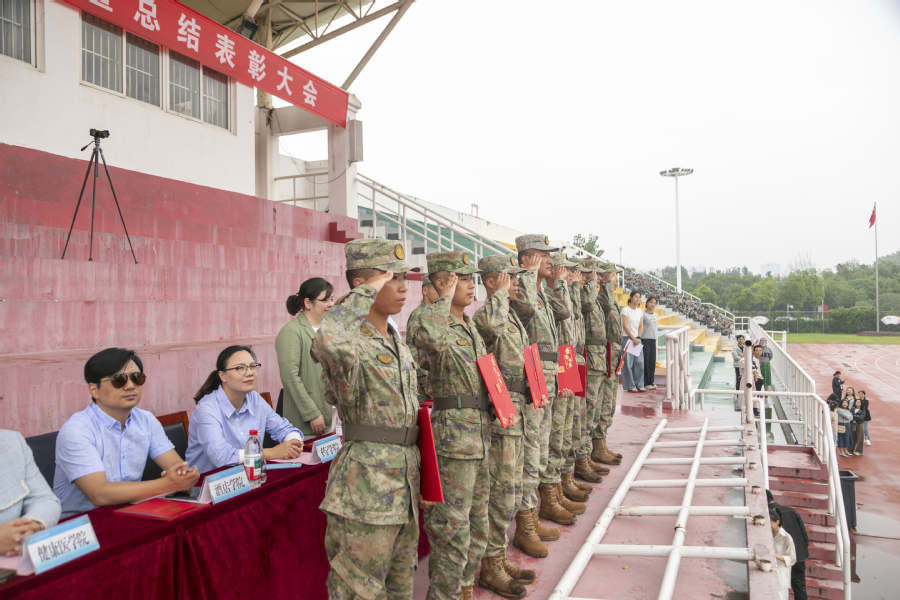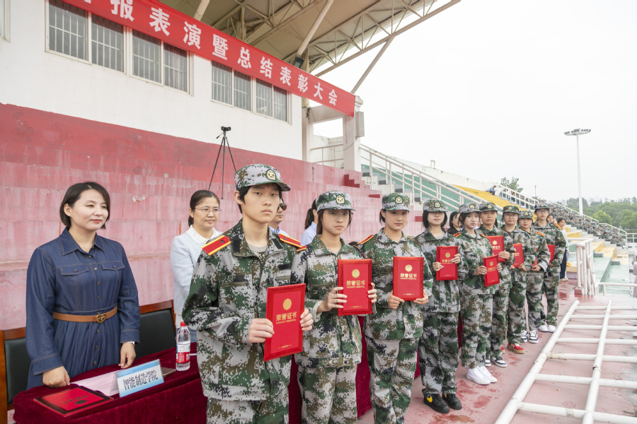 金秋九月,硕果初绽。9月29日上午9时,2025级新生军训汇报表演暨总结表彰大会在田径场举行。学校党委副书记安进,73106部队中校教导员昝金光及全体2025级新生齐聚现场,共同见证14天军训成果的精彩呈现。大会由人武部部长李金霞主持。 国旗班队员迈着铿锵整齐的步伐护送国旗入场,大会在庄严的国歌中拉开帷幕,全体师生肃立,升国旗,奏唱国歌。 随着指挥员一声令下,花样表演方阵通过队列变换,“以人为本,立德尚能”八个大字渐次成型,笔画规整、间距匀称,将学校办学理念与军训成果巧妙融合;随后,格斗术表演方阵动作刚劲利落、配合默契,尽显青春朝气;刺杀操方阵突刺迅猛,喊声震天,尽显血性胆气;匕首操方阵闪转腾挪,刀光熠熠,用紧凑的节奏展现出力量与韵律的完美结合,赢得现场阵阵掌声。分列式表演环节,23个方阵步伐统一、口号嘹亮,挺拔的身姿与坚定的眼神,生动诠释了14天军训的显著成效。 人武部部长李金霞宣读了《关于表彰2025年度新生军训先进集体与先进个人的决定》,对军训期间表现突出的集体与个人予以表彰。药学257等36个班级获评“军训先进排”,食工251班史映荷等260名同学荣获“军训先进个人”;S4B112等29间寝室被评为“内务优胜宿舍”。 党委副书记安进作军训总结讲话。他代表学校向73106部队全体承训教官的辛苦付出表示衷心感谢,向取得优异成绩、受到表彰的单位和个人表示热烈的祝贺。他表示,全体新生按照军训计划,从严训练,在阴雨连绵中铸就坚强,在挥洒汗水中收获成长,展现了我校新一届学子的良好精神风貌。他希望同学们把军训中收获的优良作风和意志品格贯穿到大学三年的学习生活中去,努力成长为社会主义事业的合格建设者和可靠接班人。 各二级学院党总支副书记,全体军训教官、辅导员参加本次活动。