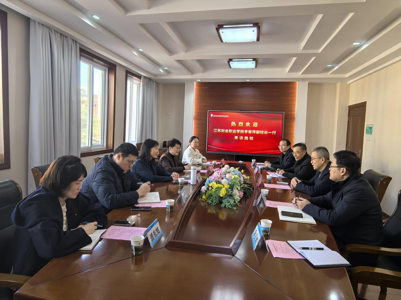 11月26日上午,江苏财会职业学院副校长李春萍一行来访我校,我校副校长张军热情接待了来宾。 座谈会上,张军副校长对李春萍一行的到来表示热烈欢迎,并介绍了学校发展情况。他指出,我校在人事制度等方面进行了一系列改革,聚焦岗位设置与聘用的科学化、规范化,构建了适配高职教育发展的分级分类岗位体系,建立了以实绩贡献为核心的差异化分配机制,充分激发教职工干事创业的积极性;同时,通过搭建“引育留用”一体化人才工作体系、构建分层分类的师资培养和成长路径,持续强化人才队伍建设质效,为学校事业高质量发展提供了坚实支撑。 李春萍副校长对我校的热情接待表示感谢,并高度评价了我校在人事管理改革中的实践探索,她简要介绍了江苏财会职业学院的办学及人事工作基本情况。随后双方就岗位管理、绩效分配、人才引育、师资培养等方面进行了交流,并建立了人事工作领域的常态化交流机制,以便今后双方互学互鉴、共促提升。 组织部、人事处等部门负责人参加会议。