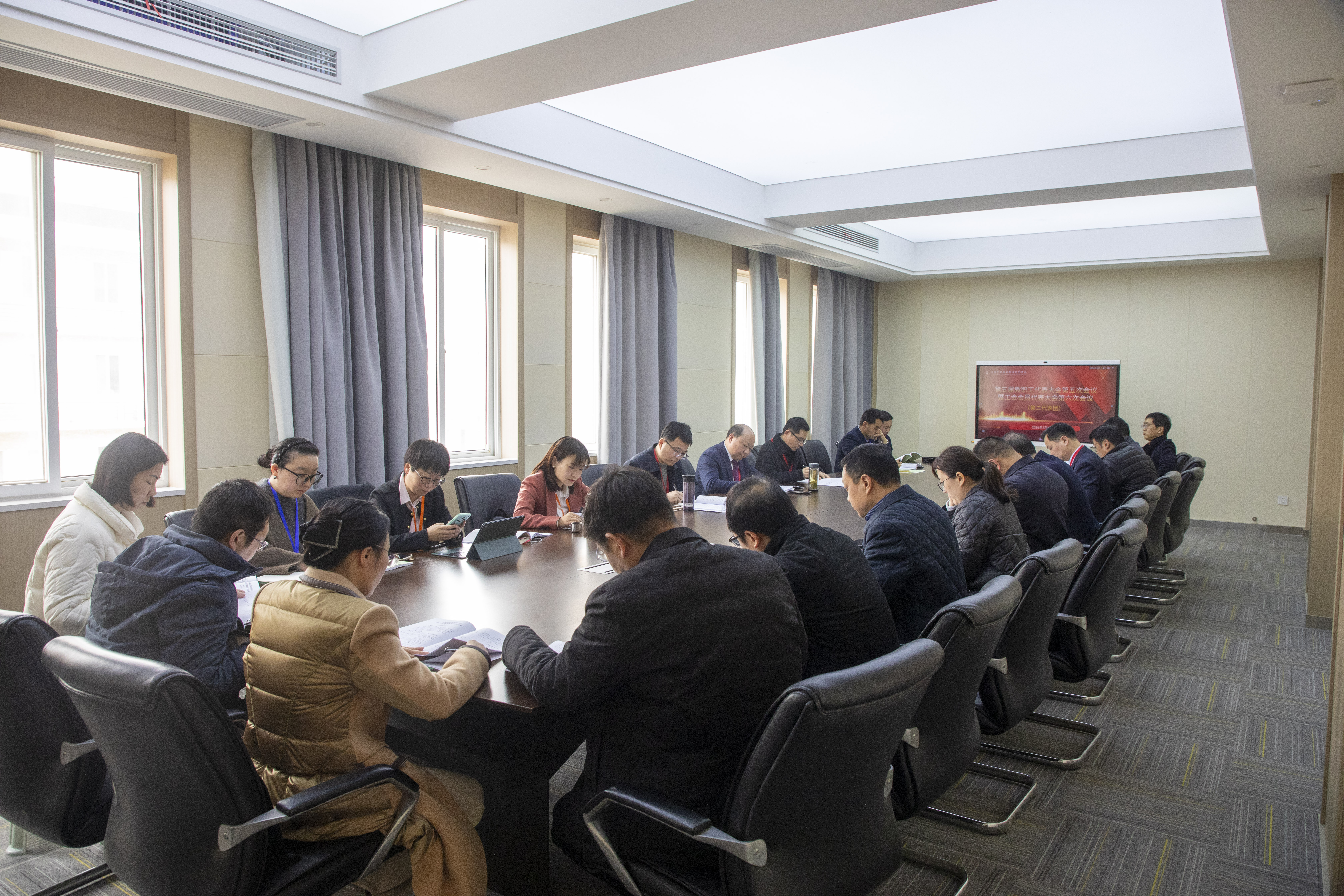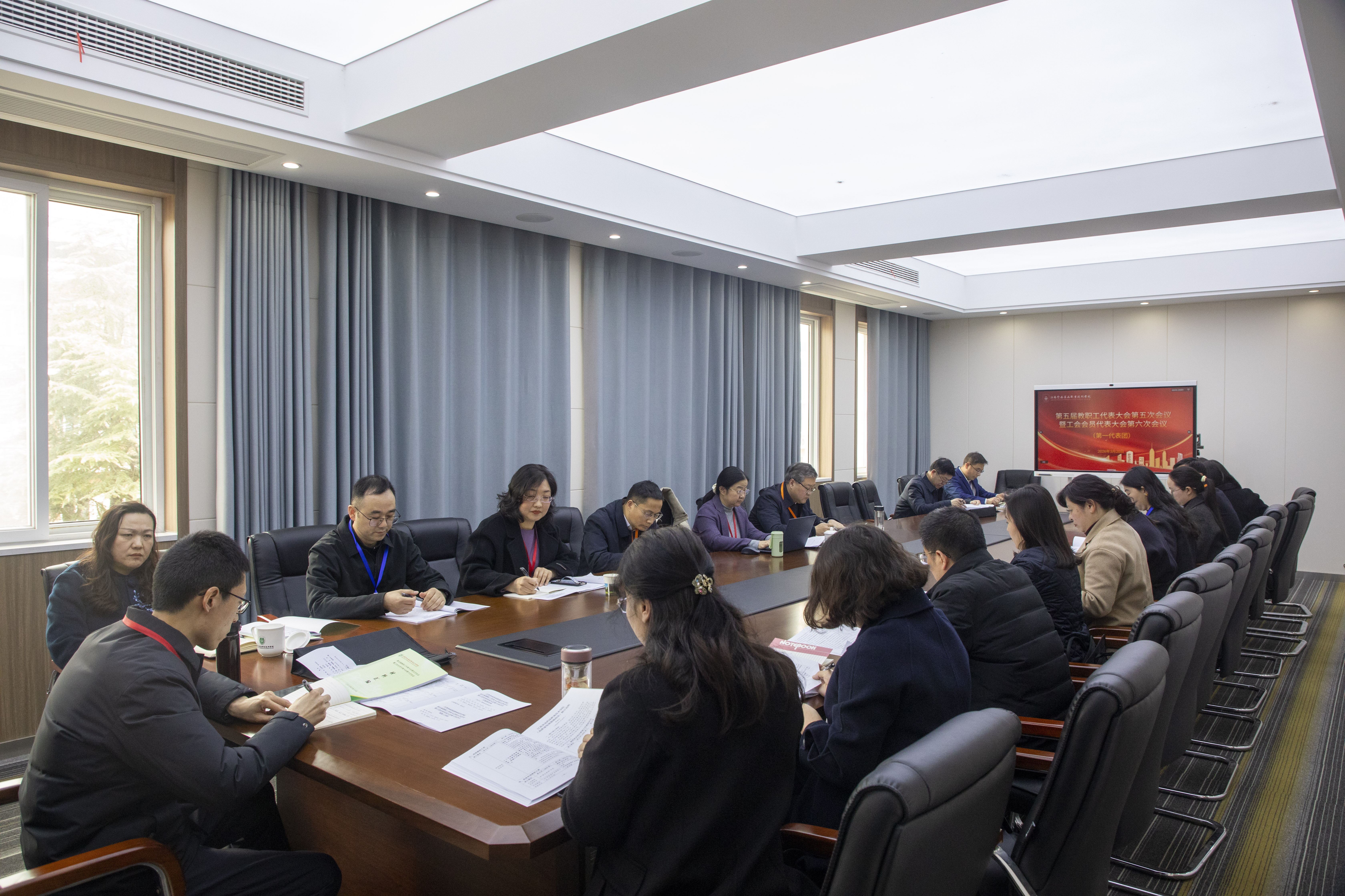 滕建林主任作《学校工会经费审查工作报告》 会议第二阶段,与会代表分为6个代表团,围绕大会各项工作报告、相关文件展开讨论。分组讨论后举行了主席团会议,大会主席团认真听取了各代表团分组讨论情况汇报,审议了学校《第五届教职工代表大会第五次会议决议》(草案)和《第五届工会会员代表大会第六次会议决议》(草案)。