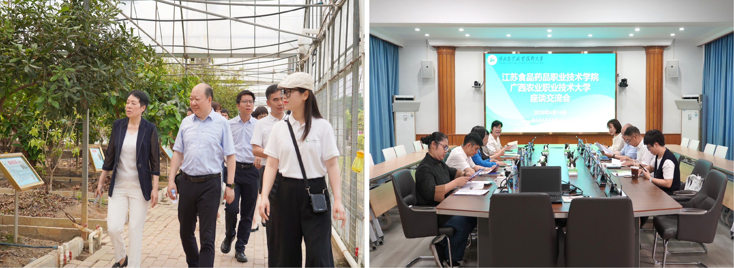 4月14-16日,校长安进带队赴广西农业职业技术大学、广西机电职业技术学院、广西商业技师学院及桂林旅游学院就职业本科专业建设、绩效激励制度改革、产教融合实训基地建设等方向开展专题调研。调研各校领导及相关人员热情接待了调研组。 在广西农业职业技术大学调研过程中,安进一行实地走访了该校食品药品工程学院八桂啤酒果醋生产车间,听取了该院阮碧芳副院长介绍的依托广西优势水果资源开展果酒及果醋生产型实训的实例和校企合作共担中试成本的机制,参观了该校获批的教育部首批校企共建“大思政课”实践教学基地“八桂田园”,探讨了从农田到餐桌“全产业链”产教融合人才培养机制。随后的座谈会上调研组听取了李向红校长关于职业本科学校和专业的建设经验,对李校长指出的要回答好高职专业升级职教本科的“必要性、适配性和可行性”三个关键问题表示赞同。